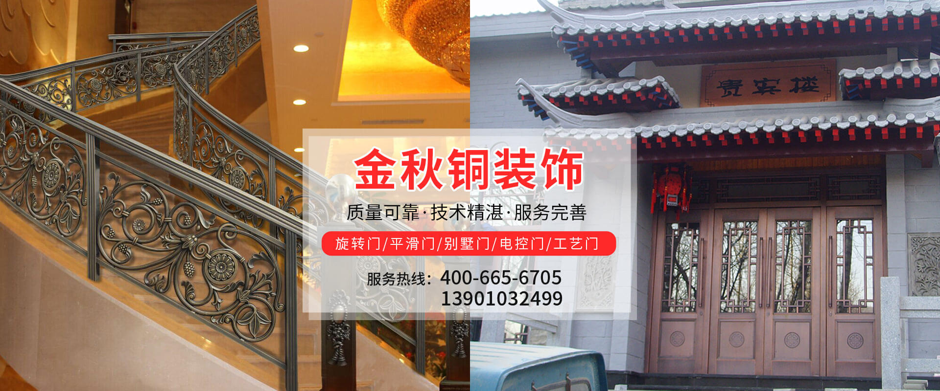 北京金秋銅裝飾材料有限公司是專業(yè)生產(chǎn)銅裝飾材料及設計、開發(fā)、制造、施工、售后服務為一體的大型綜合企業(yè)??沙薪咏ㄖ~裝飾工程及五星級酒店、別墅、博物館、樓樘管所等高檔銅裝飾項目;生產(chǎn)各種規(guī)格的旋轉(zhuǎn)門、平滑門、別墅門、電控門、工藝門、旋轉(zhuǎn)護欄、屋頂銅飾防水瓦、浮雕壁畫......